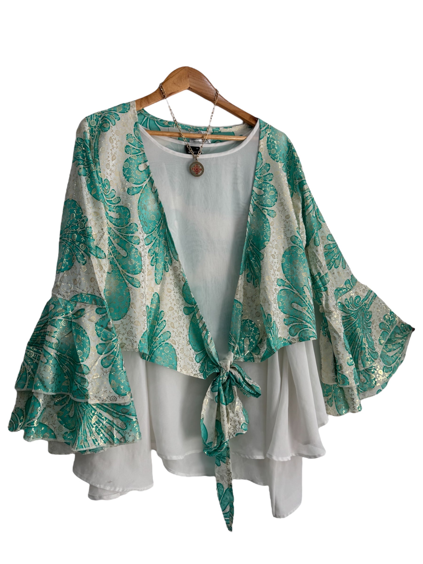 Top escote cruzado, mangas largas con vuelos.Talla estándar abarca desde S a L Materia Seda. Confección India.