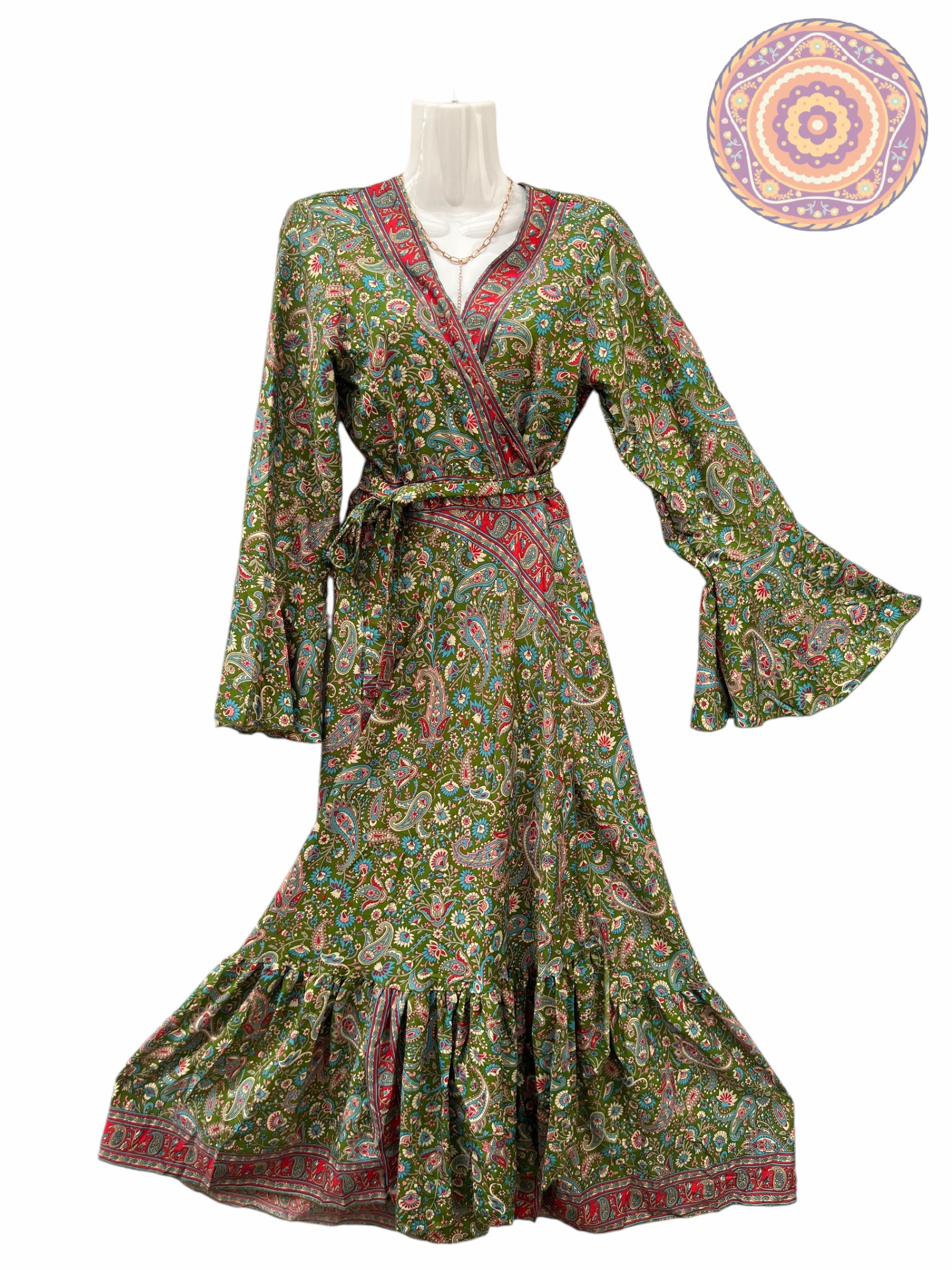 Vestido con escote cruzado, manga con vuelo y ajustable en cintura , se transforma en tapado kimono